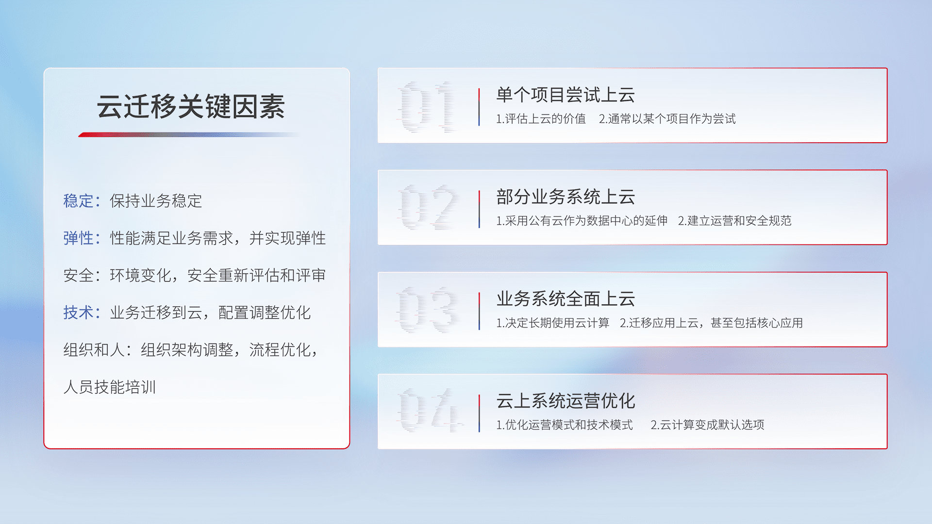 结合实际业务,,从规划设计、、云平台选型、、、、云原生改造、、、数据迁移、、、集成交付,,迁移全过程为客户识别最佳上云路径,,,,做好风险识别管理,,,设计网络架构、、身份权限、、、、安全审计合规、、、操作审计、、日志审计、、、监控告警策略、、、多站点容灾设计等,,,,对云上基础设施进行整体规划,,提升IT治理水平,,,,以满足弹性、、高可用、、、、高性能的需求。。。。