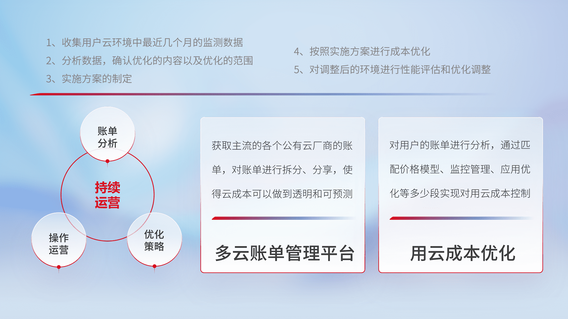 通过多云纳管,,,,以统一的资源数据模型把客户的云资源进行抽象和封装,,,,进而实现对多云资源的统一操作,,,保障云资源管理的可靠性、、稳定性与可用性。。。。量身定制化运维内容,,配置、、开发运维、、补丁管理、、、备份、、、监控、、、、认证和访问管理、、、、审计和日常巡检等,,保障在用云过程中的可靠度,,,稳定度以及高可用率。。
