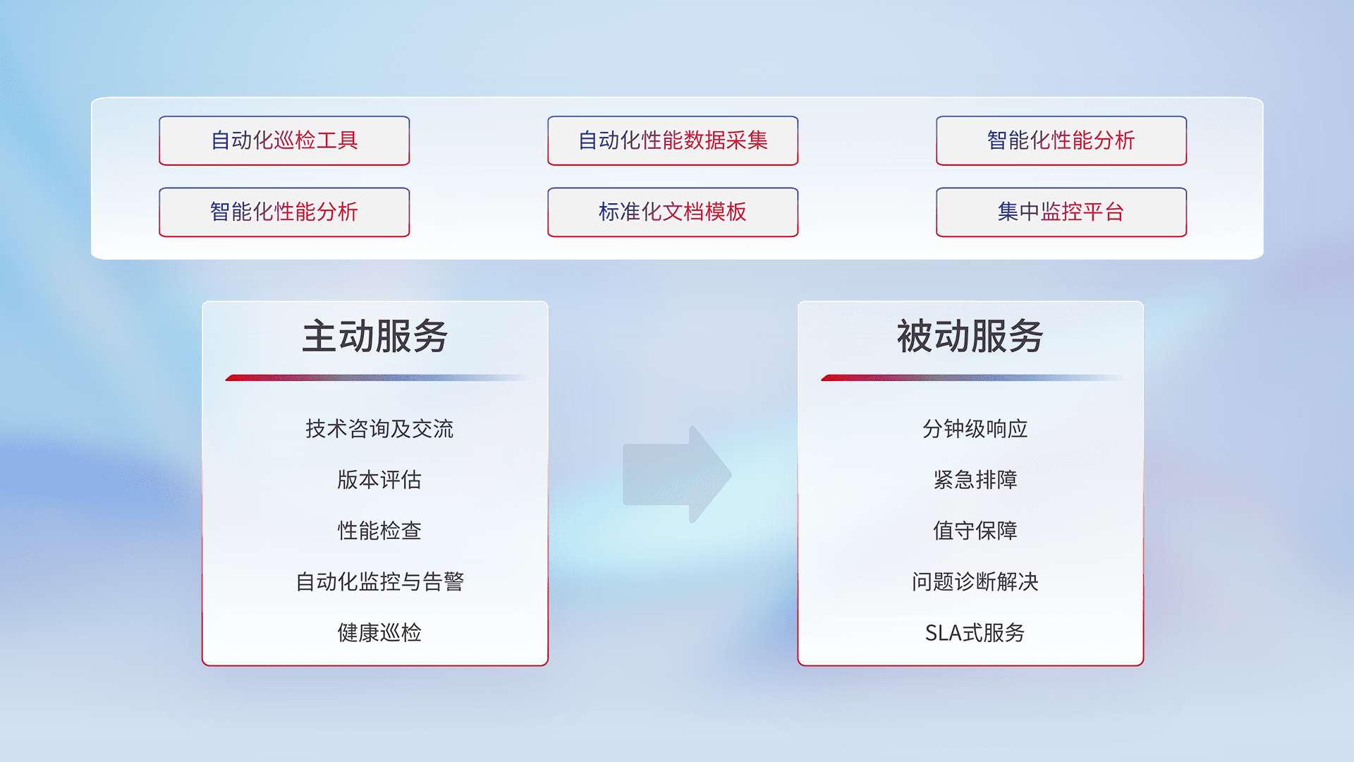 智能化工具和标准化文档,,,,保障服务质量,,,提供主动服务(包含技术咨询、、、、版本评估、、、性能检查、、、自动化监控与告警、、、、健康巡检)和被动服务包含(分钟级响应、、紧急排障、、、值守保障、、、、问题诊断解决、、、、SLA服务)。。。。